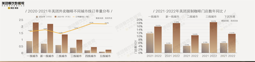 三线城市咖啡门店数量增速最快,达19%。美团外卖数据显示,三线城市咖啡订单量同比增长接近2倍,四五线城市咖啡订单同比增长250%以上,咖啡在下沉市场潜力巨大。