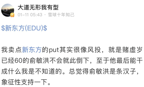 段永平表示:“我卖点新东方的PUT(看跌期权)其实很像风投,就是赌虚岁已经60 俞敏洪不会就此倒下,至于他最后能干成什么我是不知道的。总觉得俞敏洪是条汉子,象征性支持一下”。