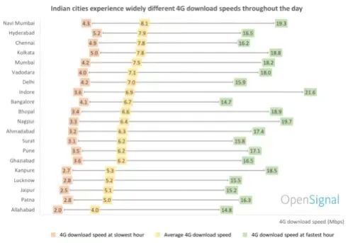 2018年2月,英国网速测试机构OpenSignal发布报告称,印度4G LTE的平均速度为6.13 Mbps,是全球4G速度最慢的国家,比斯里兰卡、巴基斯坦、缅甸的4G网速都要慢。