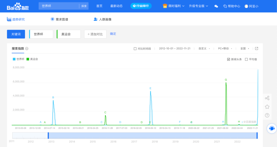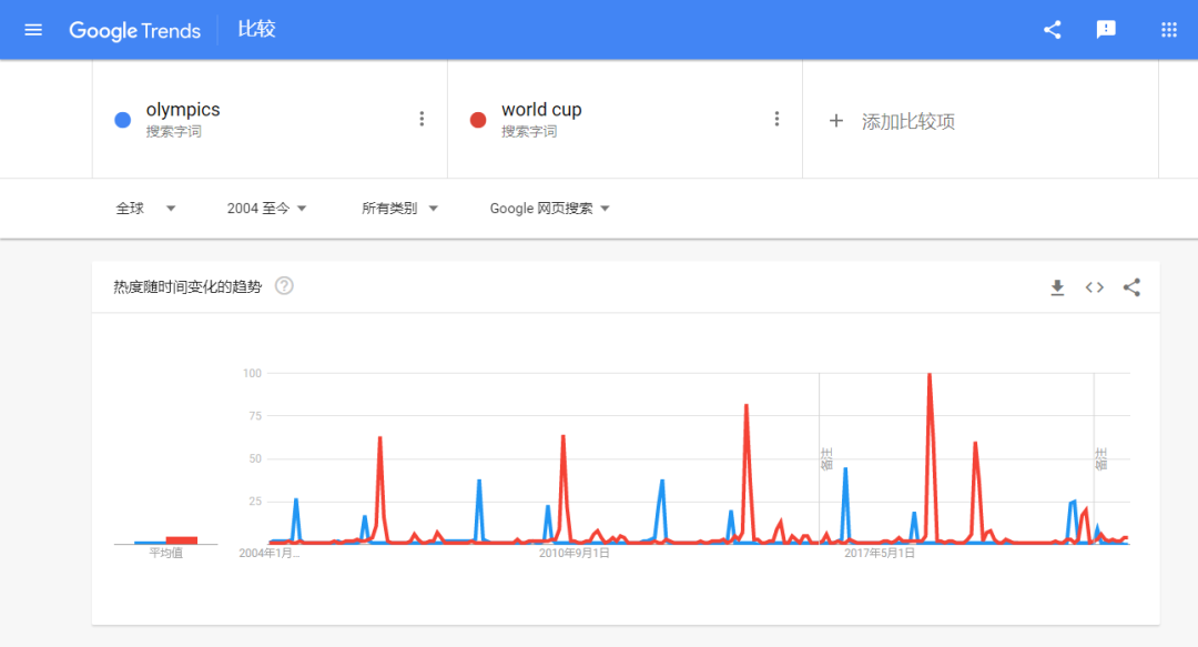 例如,对比Google Trends 从2004年至今「世界杯」和「奥运会」两项赛事的词条热度,世界杯的热度峰值几乎是奥运会的两倍。