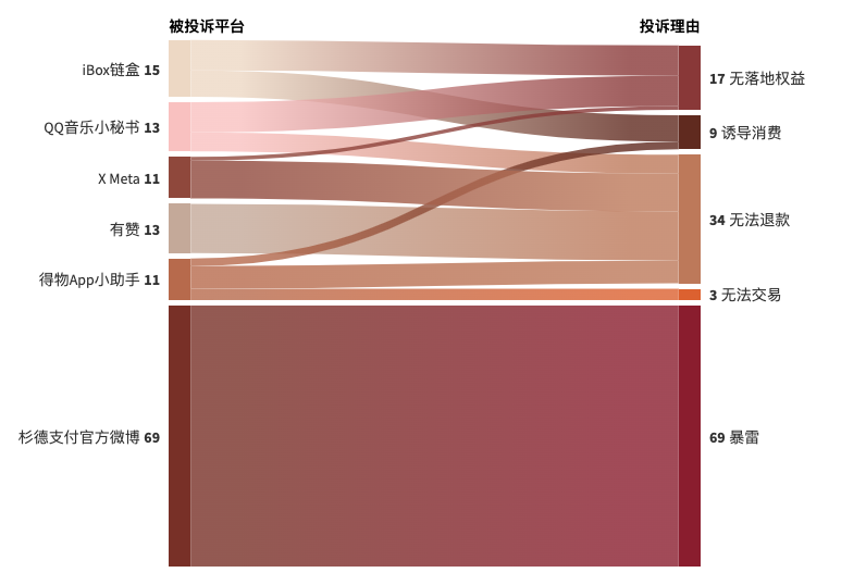 截至2022年11月25日,黑猫投诉上“数字藏品”词条下投诉数量最高的5个平台,相关投诉理由以“暴雷”“无法交易”“无法退款”“诱导消费”“无落地权益”5个用户投诉中直接提及的维度进行编码。