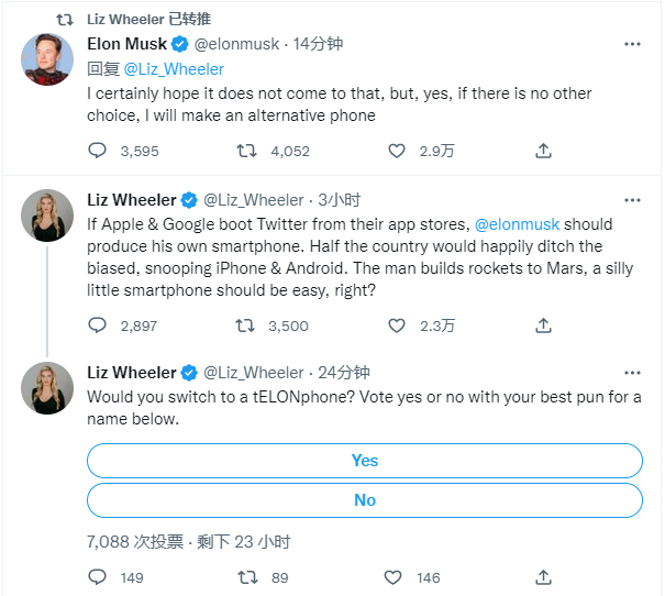 上周,马斯克就在 Twitter 上表示,如果谷歌和苹果从应用商店移除 Twitter,马斯克将计划自研一款可替代的智能手机。