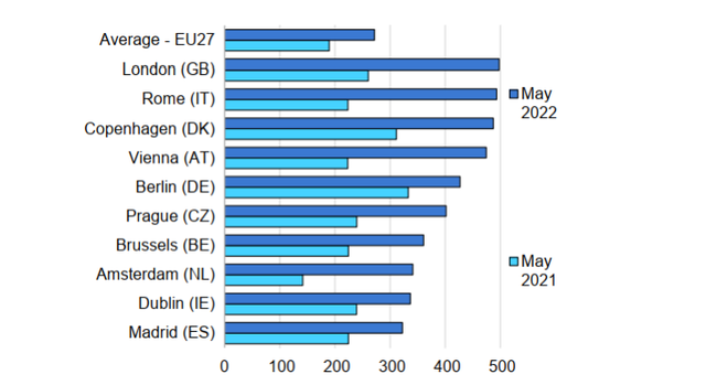 其一,由于数据中心属于典型的电力密集型行业,对电力需求极大。但近些年国外不少国家和地区的电力成本不断上涨,以欧洲为例,光大证券曾指出,2021年7月到2022年7月,欧洲五国电力现货涨幅均值250%。