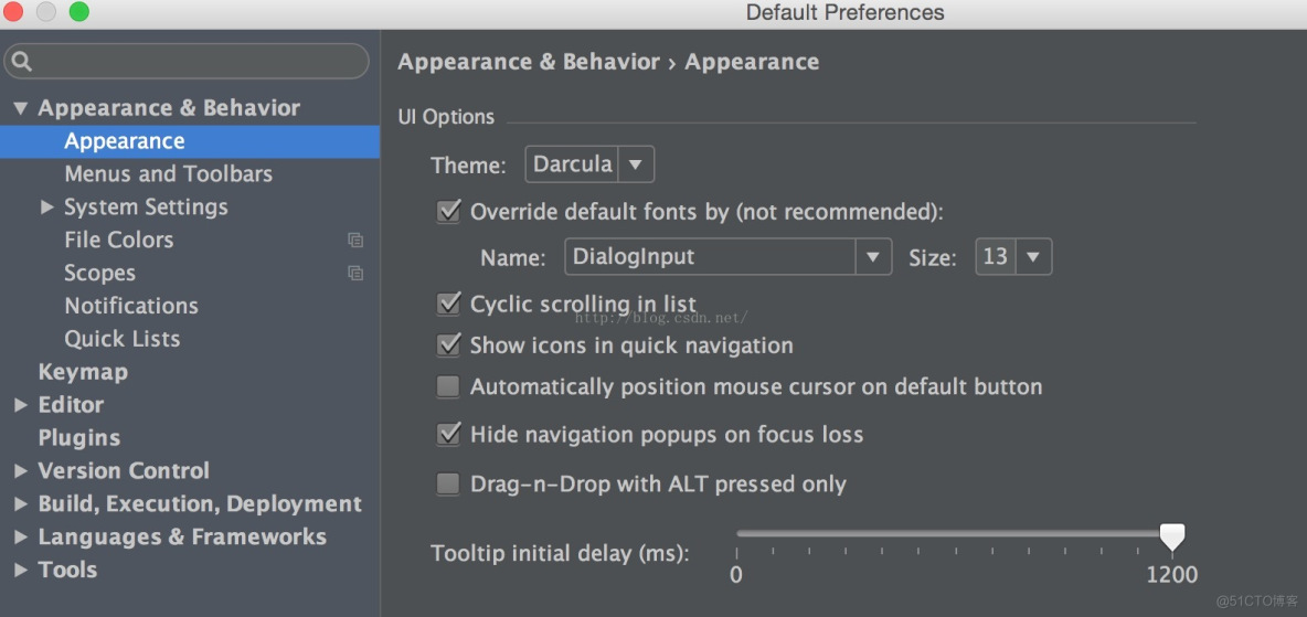 选中其中的“appearance”然后将其中的“Theme”更改为“Darcula”即可(默认是None)。然后再把他下面的那个“Override default....”下的“Name”改成“DialogInput”。这主要是为了避免出现中文乱码的情况。