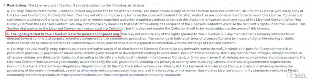 SAM模型本体为Apache 2.0协议,为宽松协议,可商用,可修改。虽然一般Meta都会额外要求不可商用,但我们目前还没看到相关的条款。论文中注明 ,SA-1B数据集在Apache 2.0许可证下开源,但仅供研究使用,项目地址如链接。