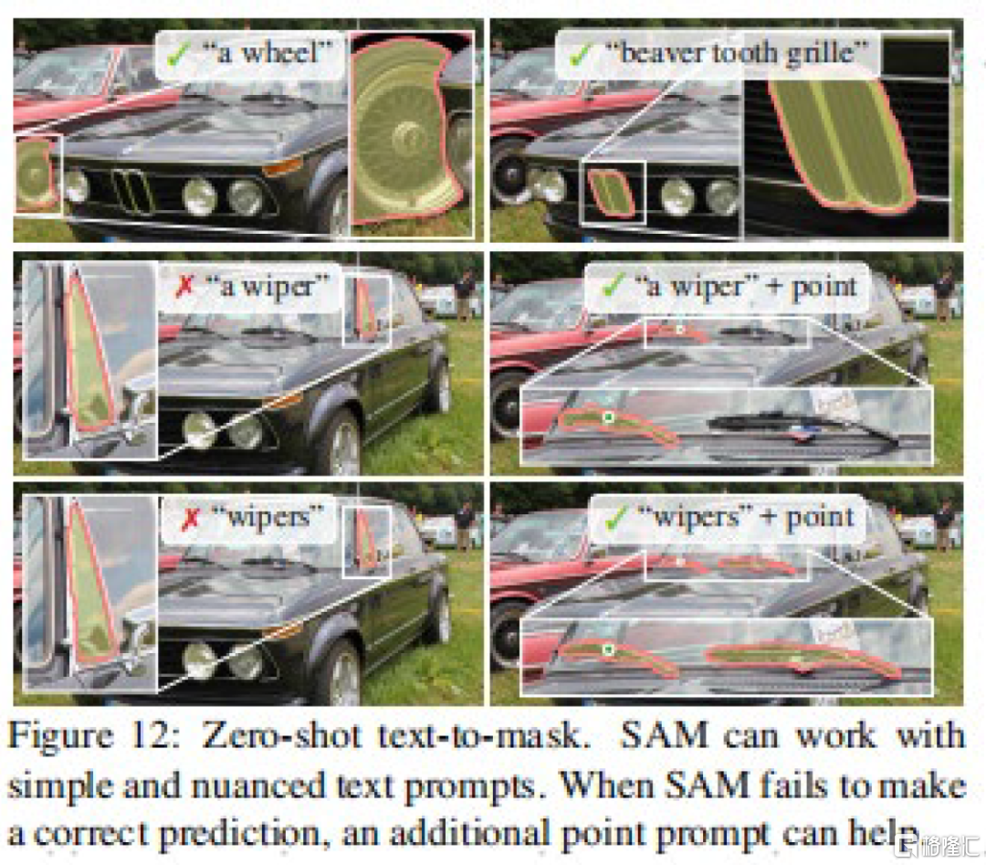 图表7:用文字要求SAM找到雨刷(Wipers),可能会失败;但是如果给一个点的提示,它能够找到一个完整的雨刷,甚至触类旁通找到旁边的雨刷
