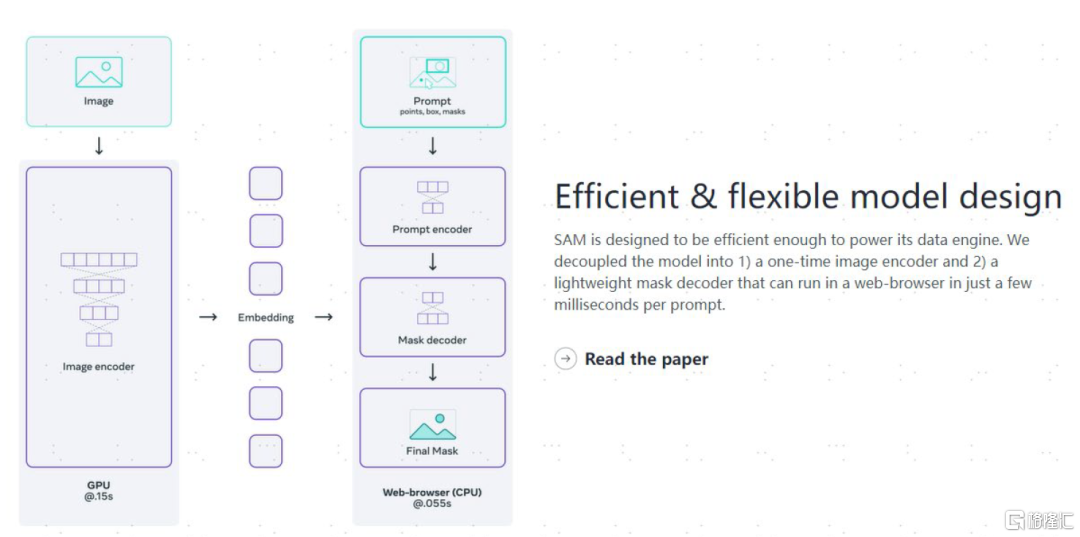 SAM具备高效灵活的模型设计。在打开图片使用后,仅需0.15秒可计算出图片的嵌入(Embeddings), 之后在网页上用CPU处理,在0.55秒内即可对文本提示/掩膜进行轻量化的编码/解码。