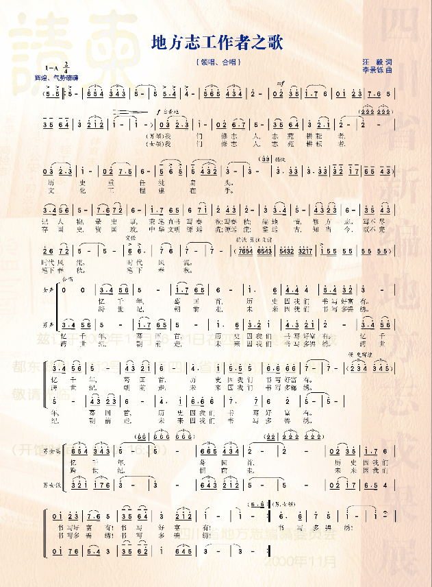 说明:《地方志工作者之歌》汪毅词,李景铄曲,载《中国地方志》《巴蜀史志》等地方志期刊,曾唱响全国方志界。