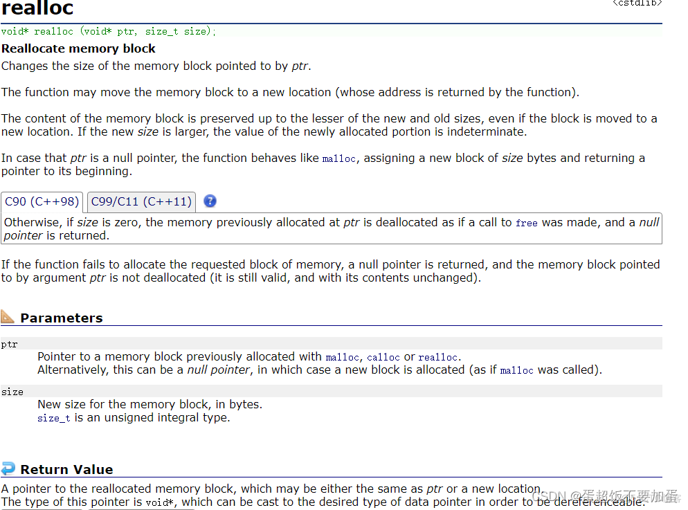 当当前数据元素个数等于最大数据元素个数时,说明空间已满,此时则需要我们进行扩容,而扩容需要我们利用的动态内存管理函数开辟空间,我们选择的是realloc函数,打开cpp网站查看该函数有关信息
