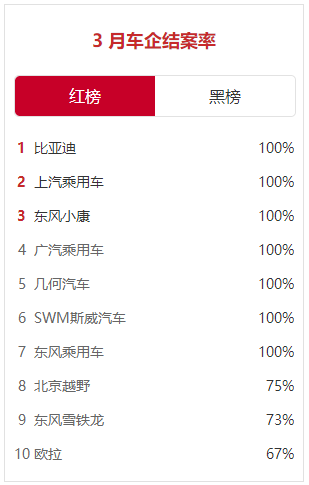 中国乘用车客户投诉3月份“红黑”榜:比亚迪等7家车企实现100%结案率