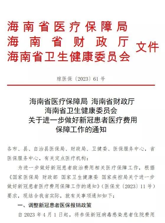 近日,海南省医疗保障局、省财政厅和省卫生健康委联合发布《关于进一步做好新冠患者医疗费用保障工作的通知》(以下简称通知),自2023年4月1日起,海南调整新冠患者医保报销政策,将参保新冠病毒感染患者住院费用全额保障、门诊专项保障等特殊保障政策转为常规医疗保障政策。