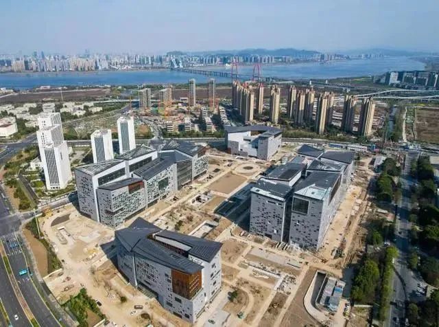 从空中俯瞰矗立在钱塘江畔的之江文化中心,目前“四馆”的主体建筑已基本完工,室内装修、景观绿化及内部道路等施工进入收尾阶段。