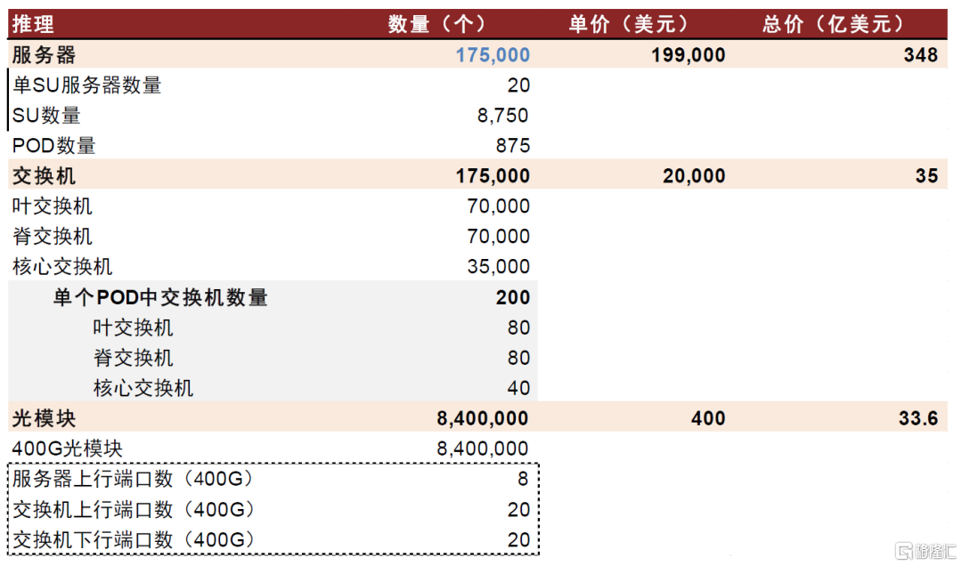 注:1:)表格中服务器台数仅基于英伟达A100等效算力测算,不代表中长期实际出货台数;2)SU(scalable units,可扩展单元):每个SU由20台服务器组成,且都有一个专用机架。