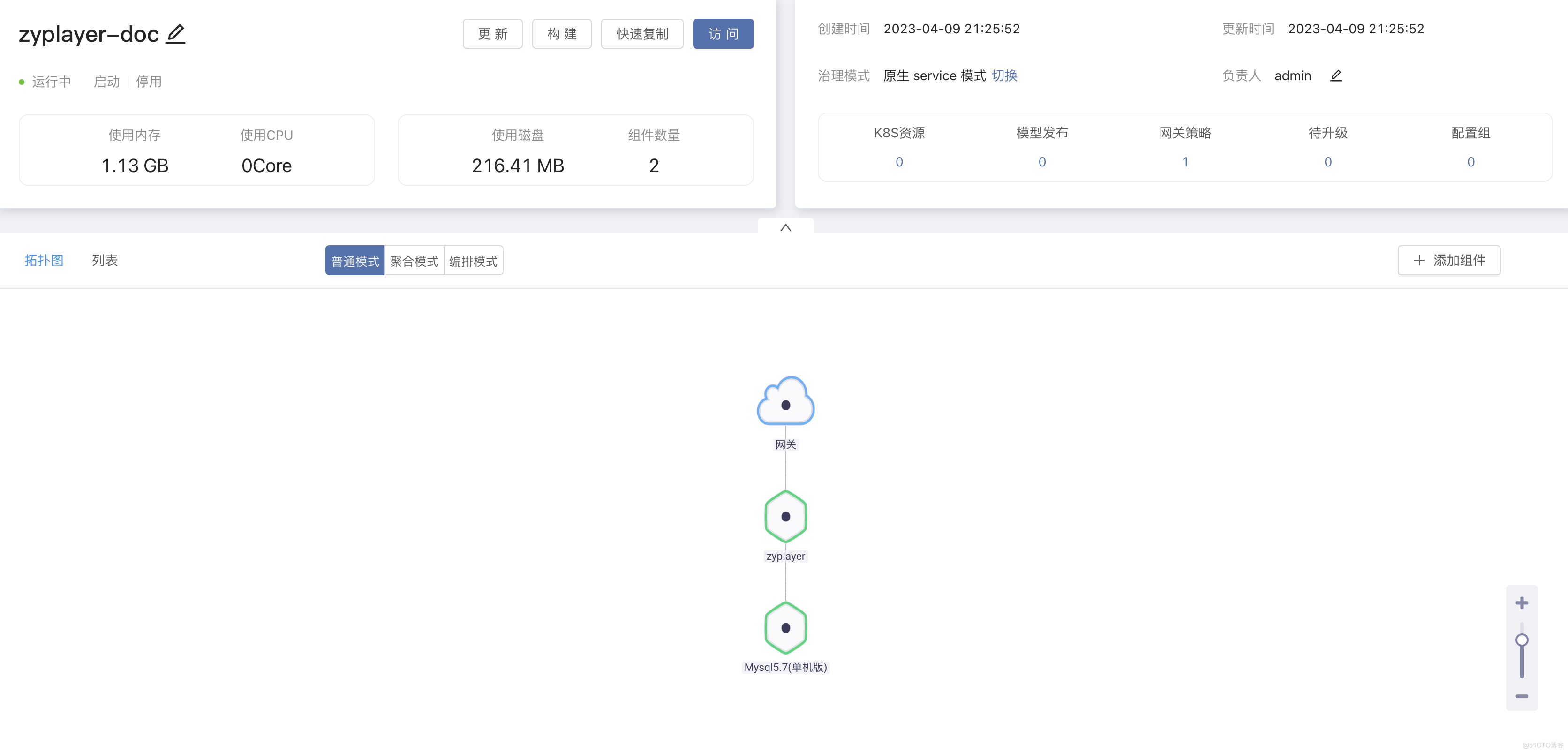 在应用内 -> 切换到编排模式,将 zyplayer 组件依赖至 MySQL 组件,这样 MySQL 组件会将自身的环境变量注入到 zyplayer 中,zyplayer 组件就可以通过配置文件中的环境变量连接到 MySQL 数据库。