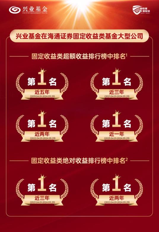 2024年第一季度结束,权威基金评估机构海通证券再次上榜。在固定收益领域深耕多年的兴业基金,牢牢占据了大型固定收益公司的超额收益排名,在最近五年、最近三年、最近两年、最后一年四个时间维度中排名第一!与此同时,在固收大厂的绝对收益排名上,兴业基金也在近三年和近两年的收益率上“技压群雄”。据悉,这是继2023年底榜单之后,兴业基金固定收益团队再次实现了超额收益和绝对收益的“霸权榜单”,也为公司11周年纪念日增添了色彩。