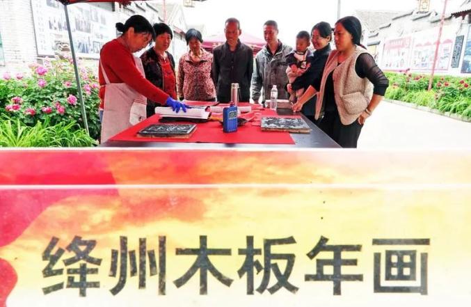 ▲运城市新深县泽掌镇光村国家级非物质文化遗产深州澄泥砚生产基地,游客欣赏非物质文化遗产深州木版年画制作技艺