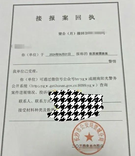 记者了解到,6月1日,彭某向长沙市公安局望城分局报案,警方已受理。