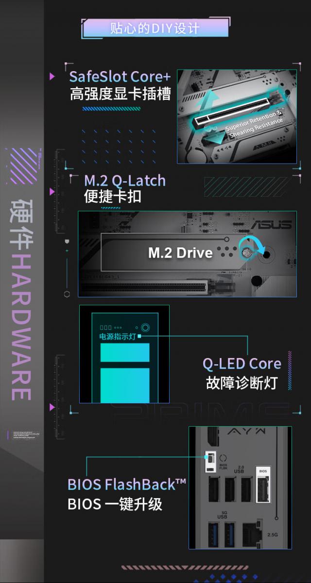 IT 世家人注意到Z790-AYW WIFI W 此外,主板还配有华硕特色。 SafeSlot Core 高韧性显卡插槽,M.2 Q-Latch 便捷锁扣、Q-LED Core 故障检测灯,BIOS FlashBack 一键升级等功能。