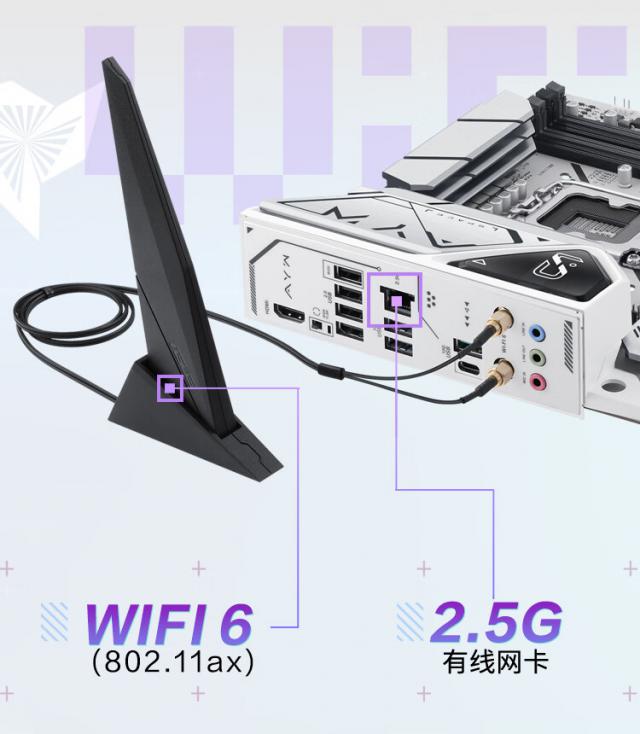 另外,这个主板配置了 2.5G Realtek 有线网卡和 Wi-Fi 6 无线网卡,附赠鲨鱼鳍天线。