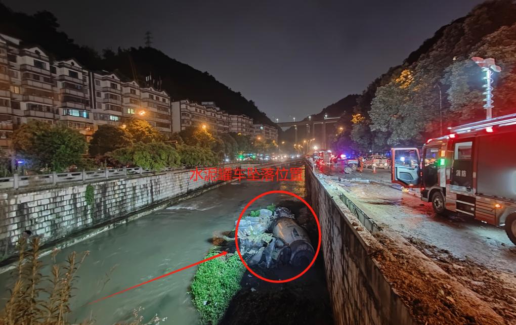 原题:“严重损坏!贵州一辆水泥罐车追尾出租车后掉进5米河里,两人陷入困境!