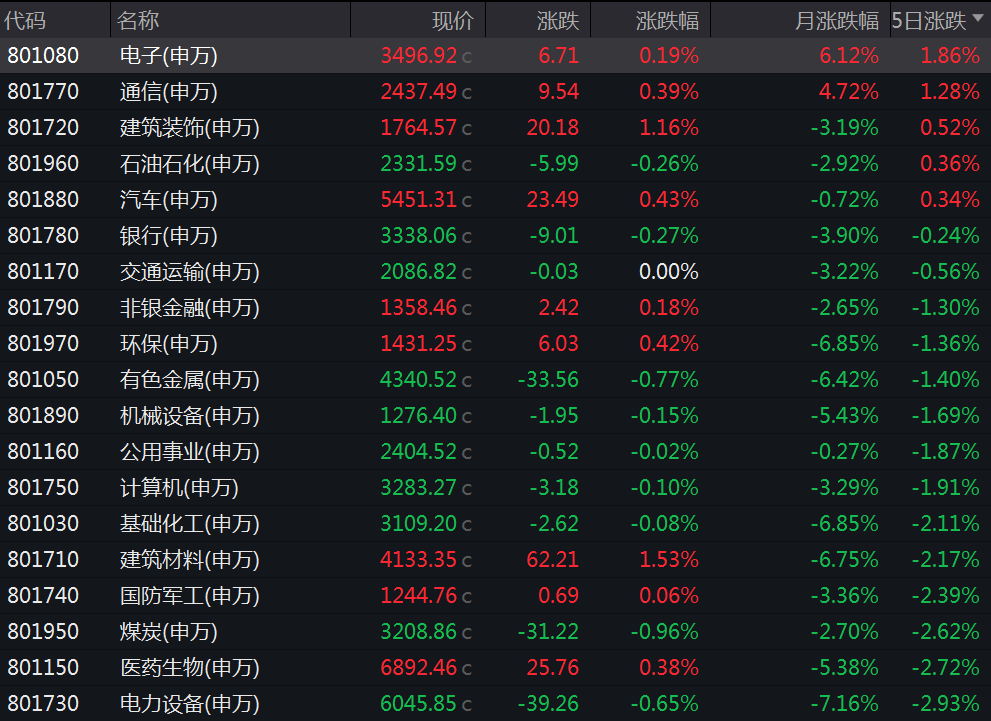 Wind数据显示,在本周的31个申万一级行业中,电子、通信和建筑装饰行业分别上涨了1.86%。、1.28%、0.52%;房地产、商业零售、媒体行业跌幅居前,各跌幅5.76%、5.16%、食品饮料行业也下降了5.12%以上。