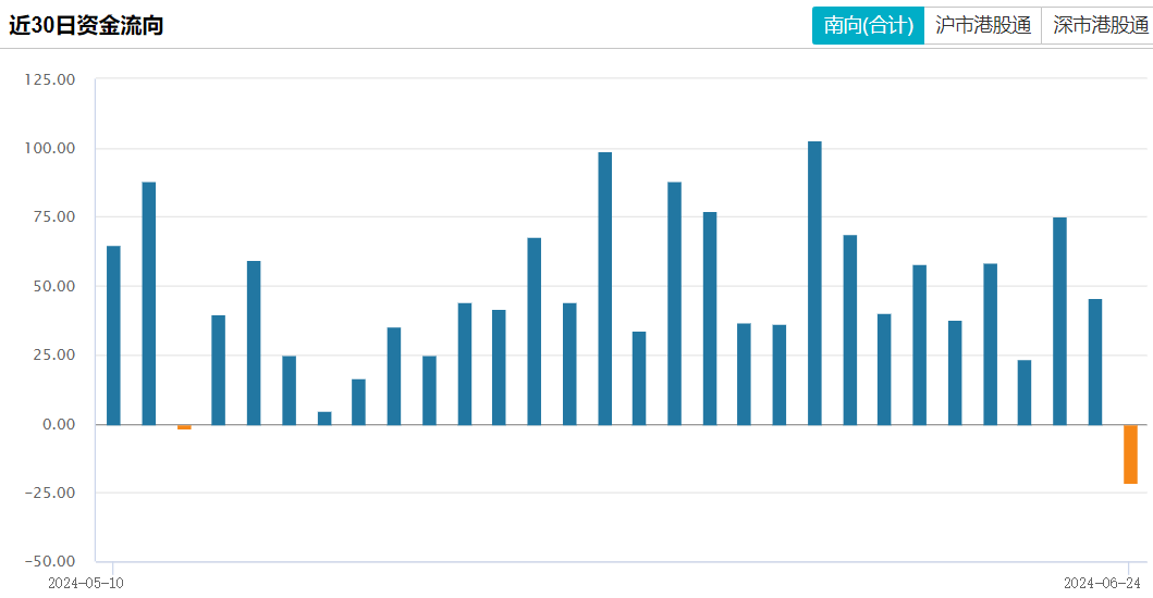 Wind数据显示,虽然周一(6月24日)南向资金出现净流出,但从5月14日到6月21日,南向资金已经连续26个交易日出现净流入。在过去的三个月里,总净流入达到2353.90亿元。