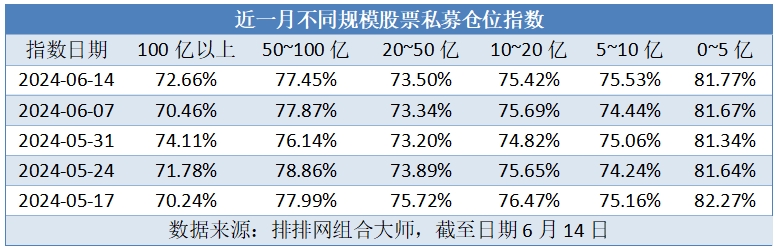 百亿私募股权加仓最为积极。私募股权排网数据显示,截至6月14日,超过100亿、50亿~100亿、20亿~50亿、10亿~20亿、5亿~10亿、0~5亿的私募股权指数分别为72.66%、77.45%。、73.50%、75.42%、75.53%、81.77%,其中0~5亿规模私募仓位最高,20~50亿规模私募仓位最低。与上周相比,100多亿私募股权增加了最多的仓位,其仓位指数比上周增加了2.20%。