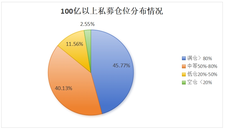 近900亿的私募仓位超过50%。私募股权排网数据显示,截至6月14日,满仓私募股权占45.77%,中仓私募股权占40.13%,低仓私募股权占11.56%,空仓私募股权占2.55%,近90%的私募股权占50%以上。与上周相比,满仓私募占比超过100亿元增长了5%,而中仓、低仓、空仓私募占比超过100亿元。