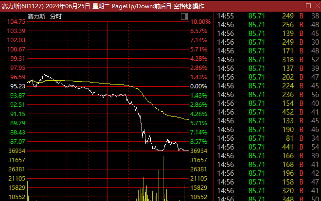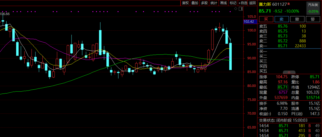 下午整车板块萎缩,赛力斯暴跌,最终以跌停收盘,截至收盘,成交量急剧扩大至95.1亿元,换手率6.98%,市值1294亿元。