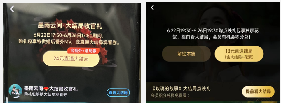 从VIP到SVIP,再到大结局的“点映礼”,观众为了快速观看这部剧而支付的费用不断上升。据《国家商报》记者统计,《生活的乐趣2》的收官仪式价格为15元,《玫瑰的故事》价格为18元,而《墨雨云间》则再创“新高”,收官仪式价格达到24元。也就是说,从5月30日的《生活的乐趣2》结束仪式到6月22日的《墨雨云间》结束仪式,短短24天,视频平台的“加码礼包”价格就上涨了60%。