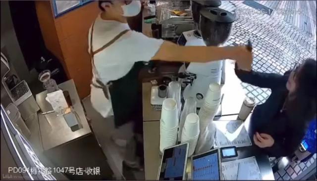 在这段视频中,面对催促,男店员不断表示“要按订单顺序做”,但还是被女顾客催着批评,拿起手机拍了拍脸,然后忍不住突破柜台,导致肢体冲突。