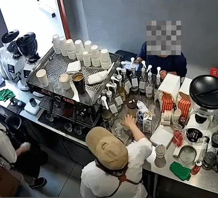 监视员一边大喊:“你抱怨啊!”,一边把咖啡粉泼向顾客。