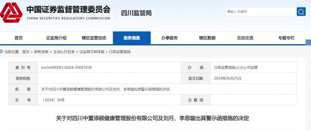 瑞财经 张林霞 6 月 25 日前,四川证监局发布了《关于对四川中置添颐健康管理有限公司和刘月、李思璇发出警告函的决定》。