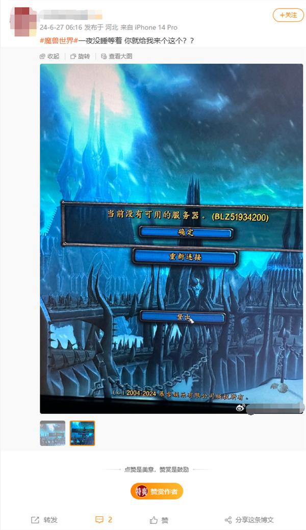 不过,在微博 # 魔兽世界 # 条目中,许多玩家发了一条信息,称自己一大早就准备登陆游戏,结果到了点服务器却无法进入。