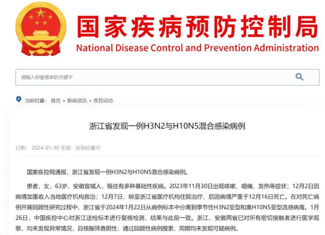 2024年1月30日,国家疾病预防控制局通报,浙江省发现一例甲型流感病毒H3N2与禽流感病毒H10N5混合感染病例。该病例是一名63岁的妇女,2023年11月30日出现咳嗽、咽痛、发热等症状;12月2日,安徽省广德县中医院因病情恶化收入接受治疗;12月7日,我被转到浙江大学医学院第一附属医院住院治疗,12月16日因病情严重而死亡。