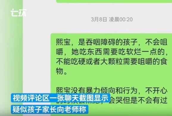 据报道,事故发生后,女孩家属质疑教师失职;导演说,父母没有告诉孩子有吞咽障碍。然而,根据网上聊天记录,怀疑父母已经告诉老师孩子有吞咽障碍。