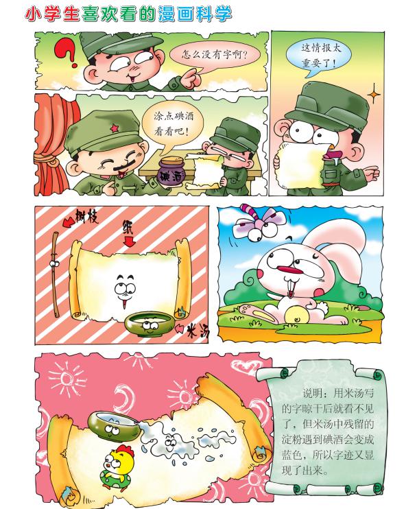 用米汤写的字干了就看不见了,但是米汤里剩下的淀粉碰到碘酒就会变蓝,所以字迹又出现了。