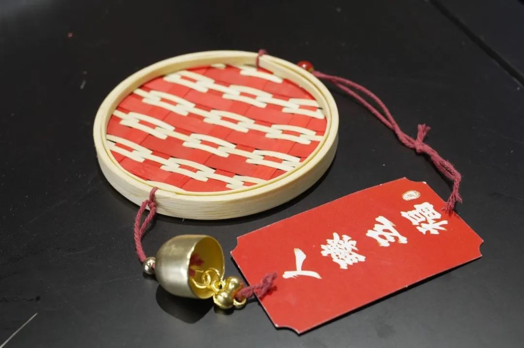 在竹环两侧系上红绳,穿上彩珠、铃铛、许愿卡等装饰品,可以通过系结的方式固定装饰品的位置;