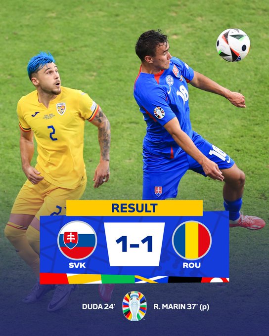 斯洛伐克中场杜达在上半场第24分钟首次开局。然而,13分钟后,在VAR的介入下,罗马尼亚得到了一个有争议的点球,马林以1比1的比分扳平了比分。