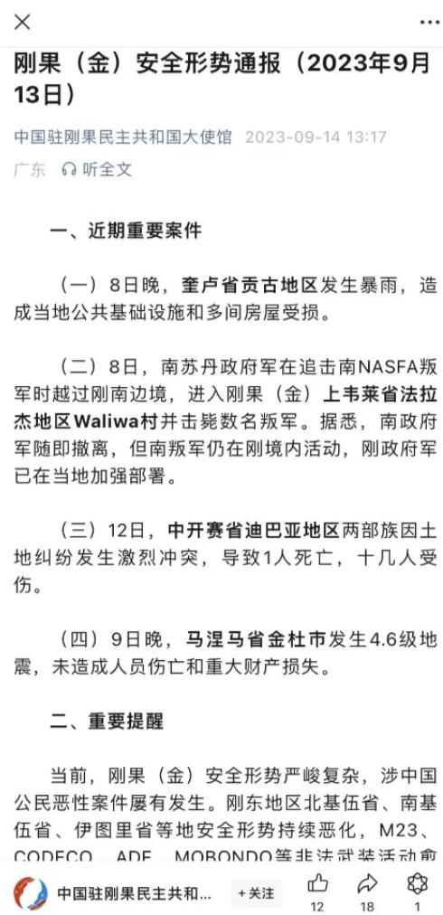 举例来说,2023年10月,紫金矿业宣布,海外分公司已经获得了国家矿业部批准的Manono矿东北部项目的采矿权。但一个月前,中国驻刚果民主共和国大使馆发文称,“刚果(黄金)安全形势严峻复杂,涉及中国公民的恶性案件屡见不鲜”,中国公民和中资机构应高度重视当地安全形势,加强风险防范意识。这些表明,紫金矿业相关项目面临着巨大的风险。