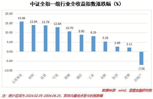 行业应如何选择,我们可以参考上一轮救市过程中各行业的表现。以便 2 月 5 日至 6 月 25 日期统计显示,根据中国证券指数一级行业全收益指数排名,公共事业、材料、信息、可选、能源、通信、工业、金融、医药、消费、房地产等涨跌幅度由高到低。