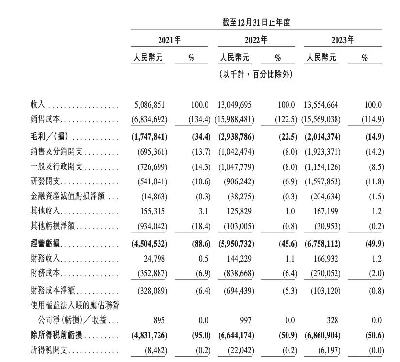 在毛利方面,合众汽车的毛利率从2021年的-34.4%提高到2022年的-22.5%,2023年的毛利率提高到-14.9%。