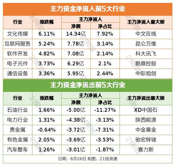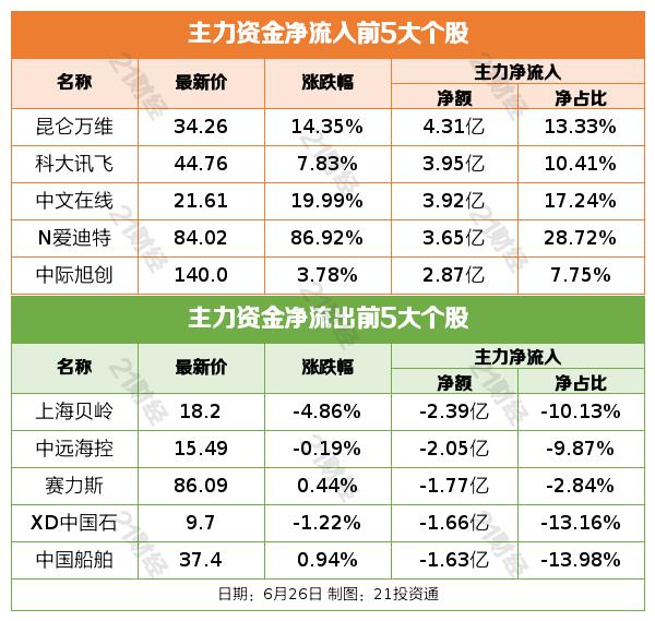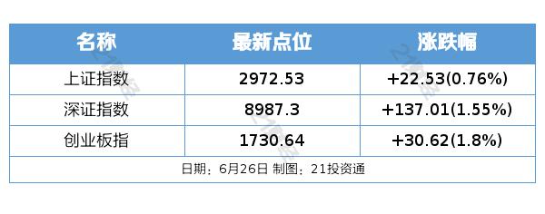 6 月 26 日,A 股票三大指数集体上涨,截至收盘,沪指上涨。 深成指上涨0.76% 创业板指涨1.55%。 1.80%,北证 50 指数涨 沪深京三市1.76%的成交额 6464 其中沪深两市亿元 6434 与前一天相比,亿元缩量 48 亿元。两市超 4800 只有股票上涨。板块主题上,Sora 概念、AI 语料、媒体板块涨幅居前;贵金属,ST 该板块跌幅居前。