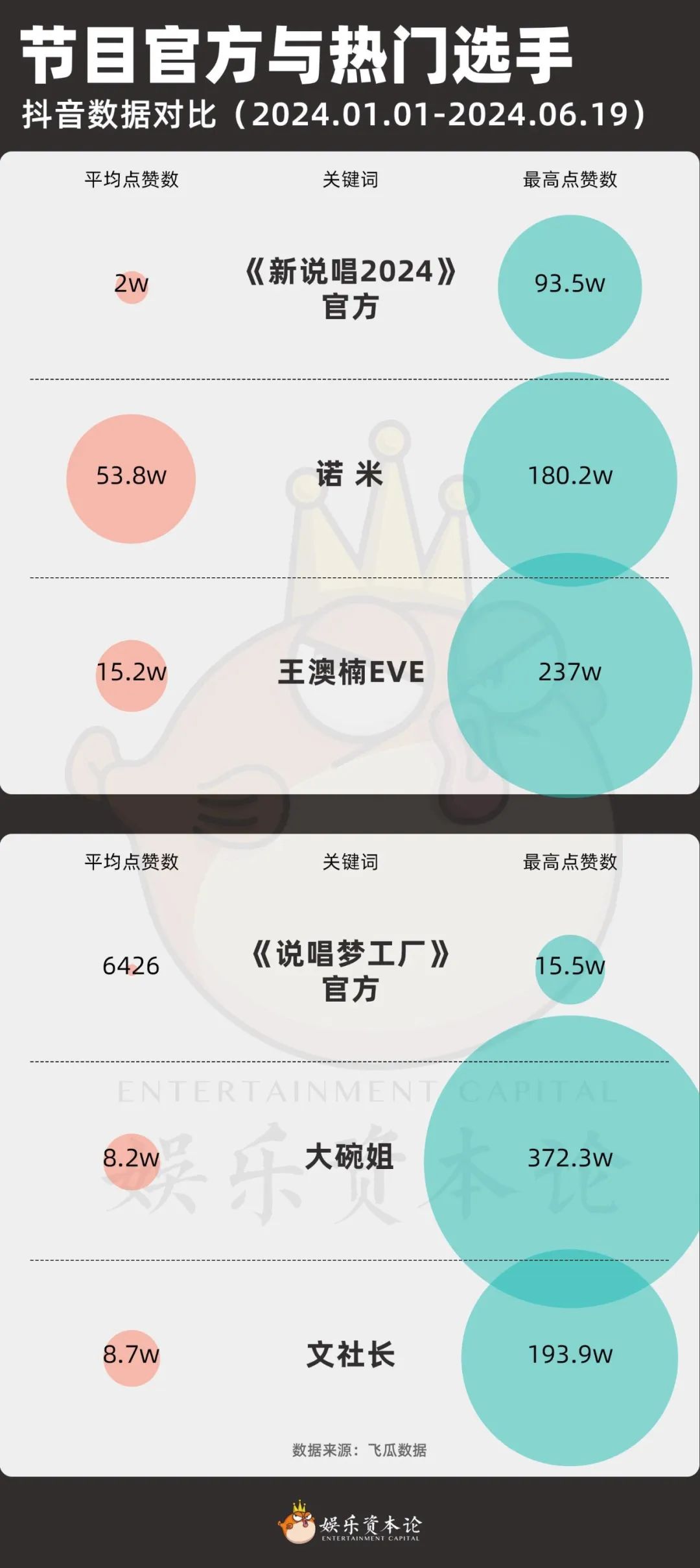 对今年最受欢迎的Rapper来说,自然是节目中“一轮游”的诺米。截至目前,诺米的抖音粉丝超过329.6万,视频平均点赞达到53.8万。而且《新说唱2024》官方抖音号平均点赞只有2万。