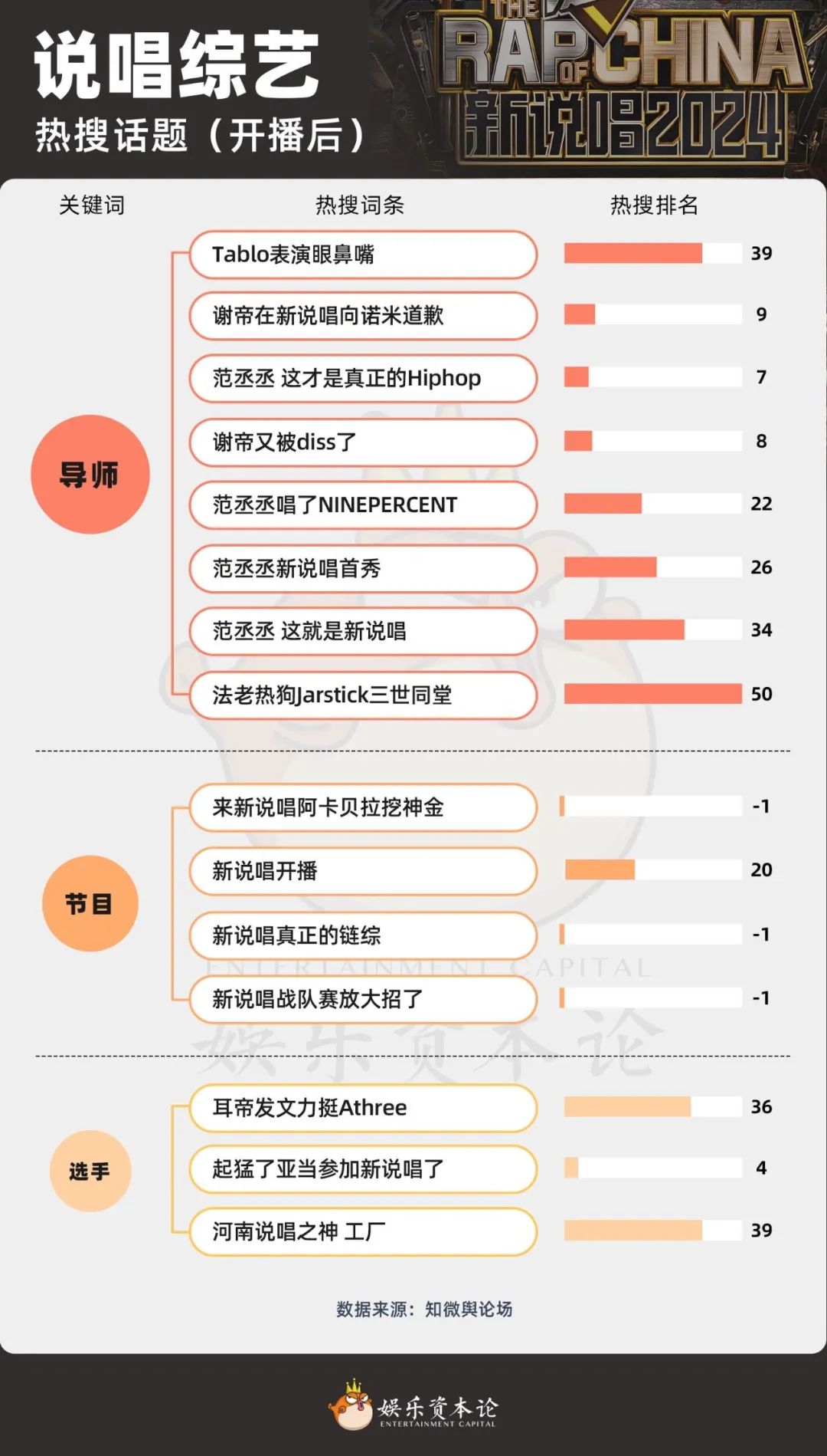 一位说唱歌手的经纪人邓雷告诉娱乐资本理论,判断一个节目是否“流行”有两个标准:第一,是否有输出“hit song(热门单曲),第二,是否有“造星”。