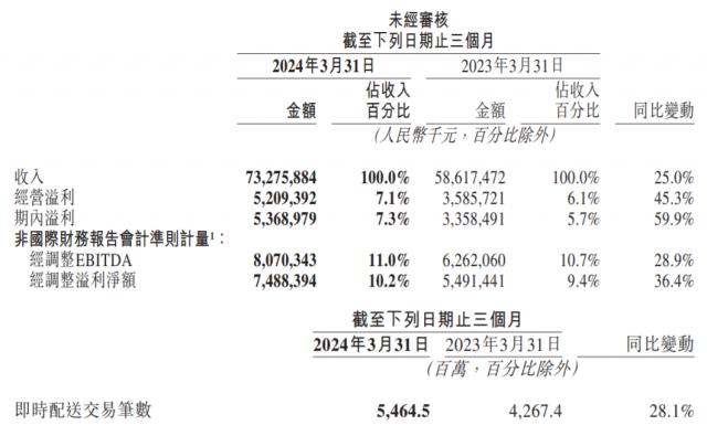 截至 2024 年 3 月 31 当天,美团即时配送交易笔数为 54.65 与去年同期相比,亿笔 42.6 亿笔增长 28.1%。