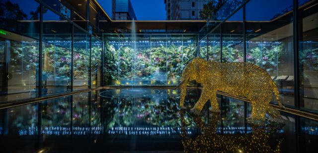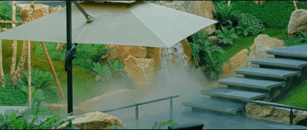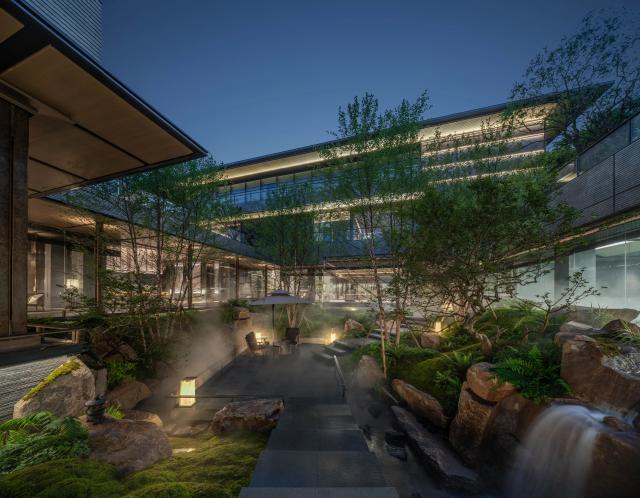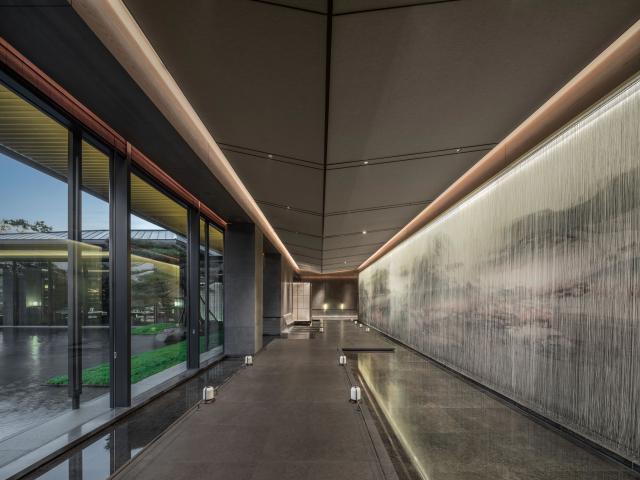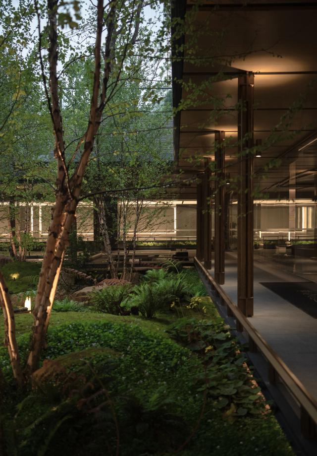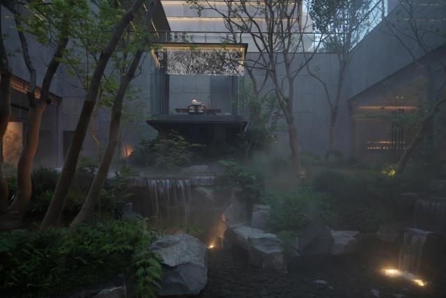 使用玻璃 水合作用,辅以置石、松林、丘谷、苔藓,在打造山石叠瀑的宋风园林的同时,营造出轻盈优雅的感觉。