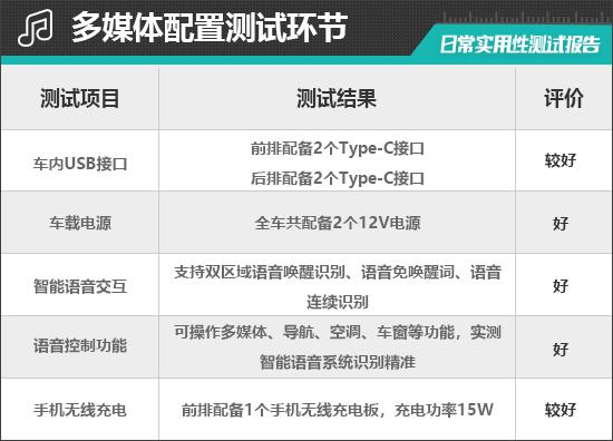 评估车在前排中央扶手箱前部配置 1 一款手机无线充电板,充电功率为 15W。由于充电板采用垂直设计,且充电板位置较低,驾驶员取放有些不方便,所以稍有不足。