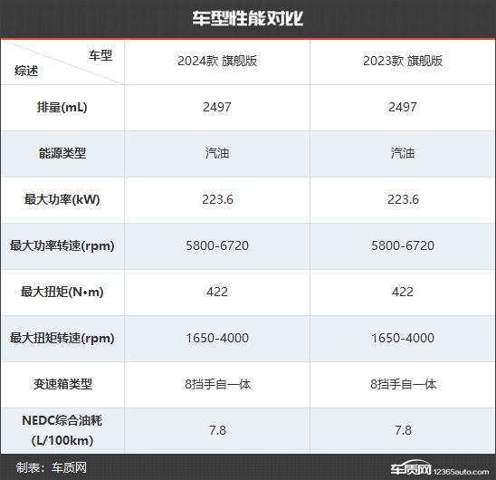 在动力装置方面,新车型仍然配备了动力装置。 2.5T 涡轮增压发动机 8 速手自动变速箱的搭配,最大功率和最大扭矩与老款车型相同。