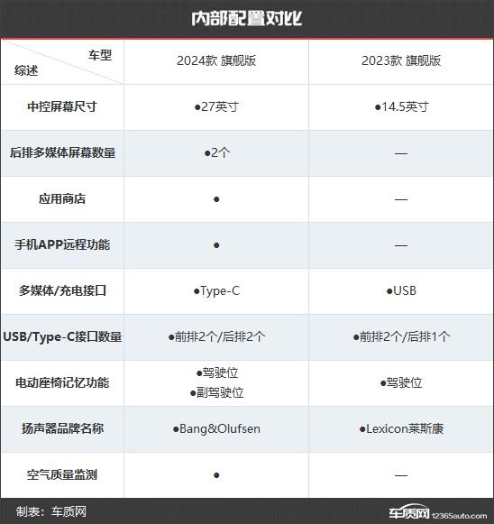 除内饰设计更年轻化外,新款车型的内部设备也与时俱进,增加了不少流行设备。例如增加了应用商城和手机 APP 远程功能,前者可以下载更多的车载应用,使用方便;后者可以远程操作车辆,提前开空调等,非常实用。并且后排也提供了 2 支持多媒体屏幕 B 车站、爱奇艺、优酷等地方应用,这在进口车型中是非常罕见的。此外,USB 接口采用老款车型 Type-A 调整为 Type-C 后排接口的数量也增加到接口, 2 一是方便后排乘客使用。值得注意的是,新车型也采用了 Bang&Olufsen 扬声器,用户可通过中控屏调节环绕声,可选择“舒适”、"明亮"、音频设置,如“活跃”和“温暖”,是音乐爱好者的福音。